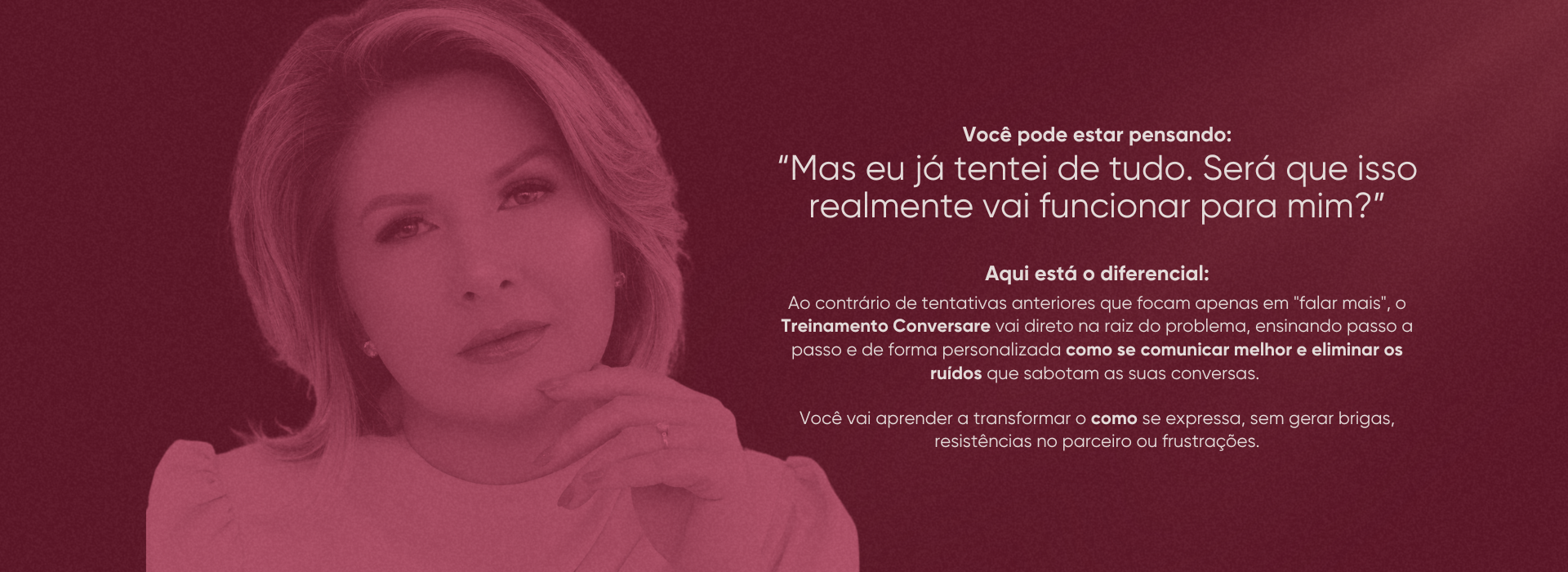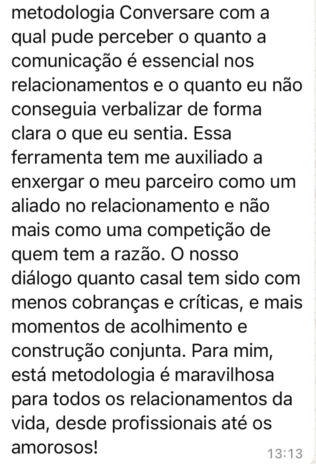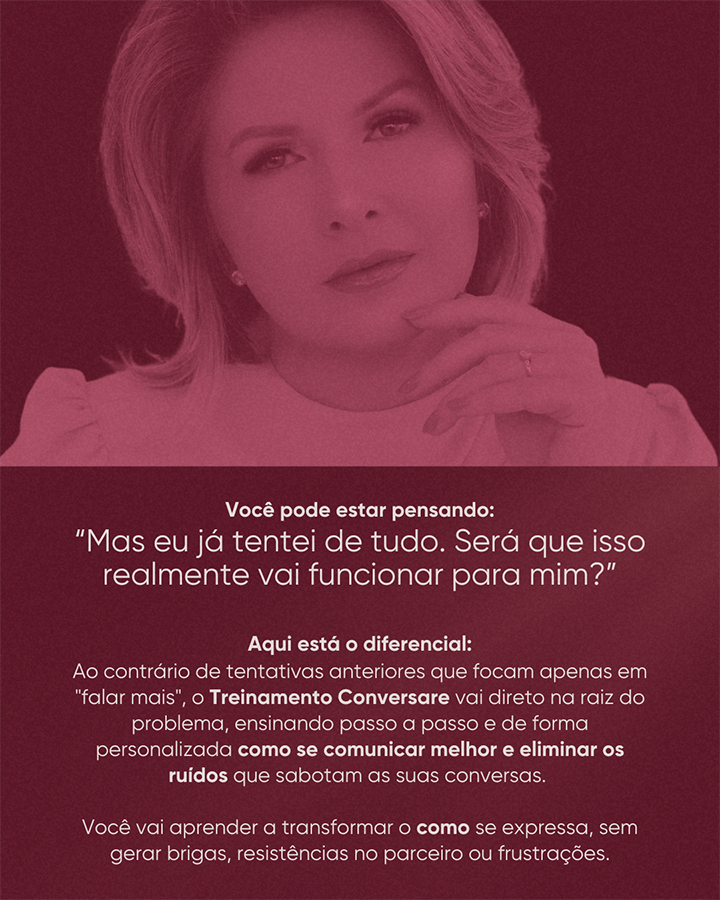 Foi exatamente por isso que desenvolvi o Treinamento Conversare, um método prático e direto para você aprender a se comunicar de forma clara e estratégica, eliminando os ruídos que sabotam a sua comunicação e transformando a maneira como expressa suas necessidades no relacionamento, sem criar resistência ou afastamento no seu parceiro.